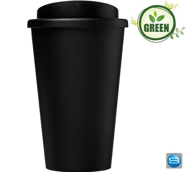 Doppelwandiger Isolierbecher mit 350ml Volumen, hergestellt aus 100% recycelten Materialien mit praktischem Drehverschluss. Der Schwarzton des Bechers kann je nach Art des recycelten Materials variieren. Hergestellt in Großbritannien. Die Abnahmemenge pro Auftrag ist auf 2.000 Stück begrenzt. Ihr Logo oder Ihre Werbung können in bis zu 4 Farben rundum auf den Becher gedruckt werden.