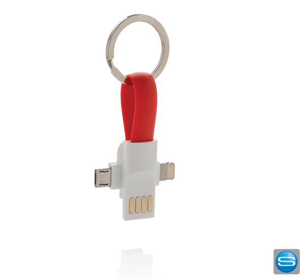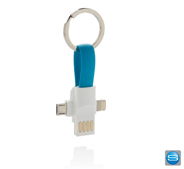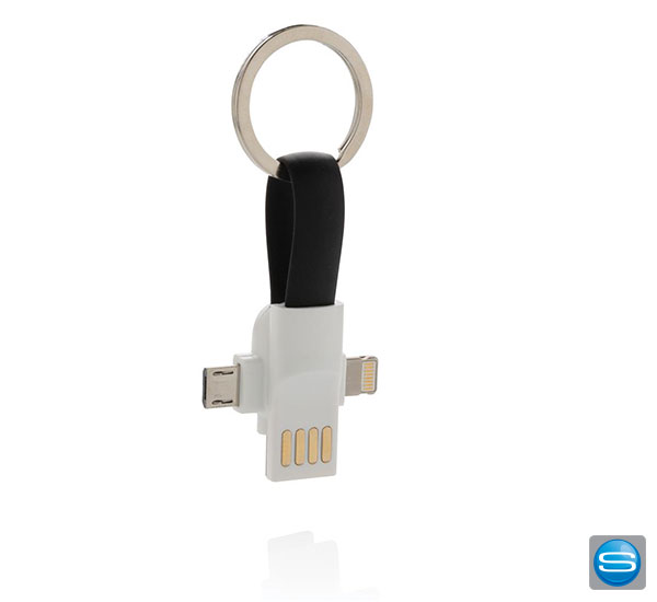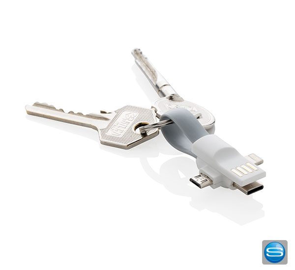 Mit diesem Aufladekabel können Sie bequem jederzeit Ihre Smartphones aufladen. Sei es ein iOS-, Android oder Google-Gerät, durch den Lightning-, Micro-USB- und Type-C-Anschluss hat Ihr Handy immer Akku. Durch die magnetischen Enden können Sie das Kabel an Ihren Schlüsselbund befestigen. Zudem können Sie mit diesem Werbeartikel auch Daten übertragen. Gerne bedrucken wir Ihnen das Ladekabel mit Ihrem Logo oder Motiv.