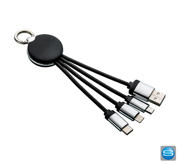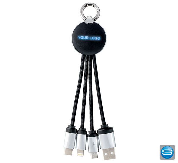 Multi-Ladekabel mit hinterleuchteter Logogravur. Das Mehrfach-Ladekabel verfügt über einen Apple-8Pin- , einen USB Typ C-, einen Micro USB- und einen USB-Anschluss. Je nach Modell leuchtet Ihr Logo in blau, rot, grün, weiß oder mit Wechsellicht. An der Oberseite des Ladekabel befindet sich zusätzlich ein runder Karabiner für die einfache Befestigung und Entnahme vom Schlüsselbund.