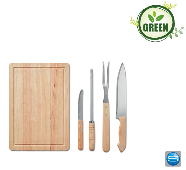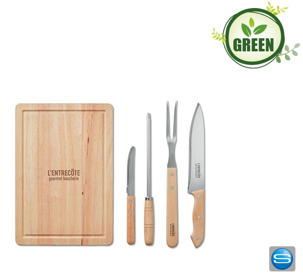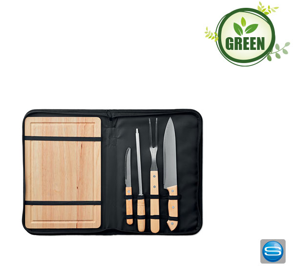 | Werbeanbringung: | Mit Druck auf Vorder- bzw. Rückseite der Polyestertasche oder mit Gravur auf das Schneidebrett, das Messer oder die Grillgabel |