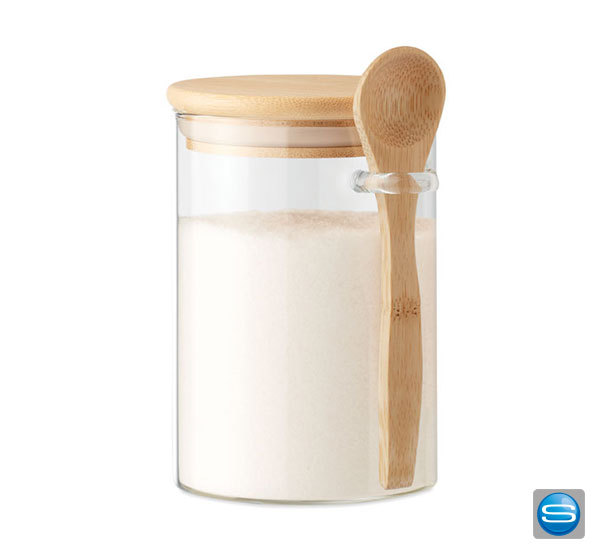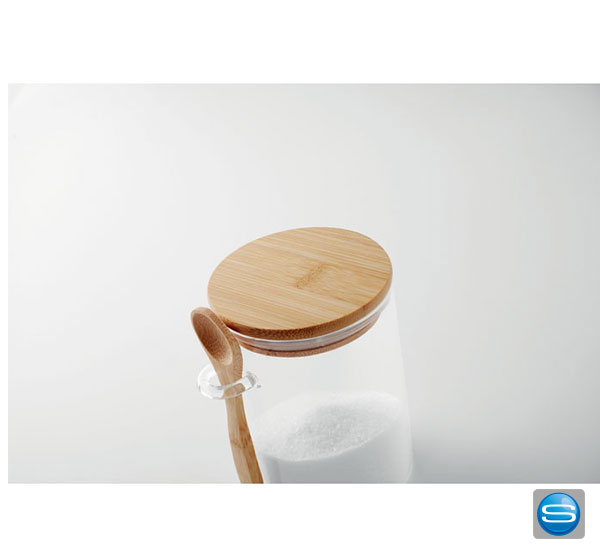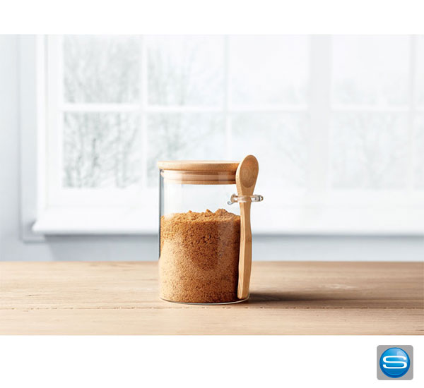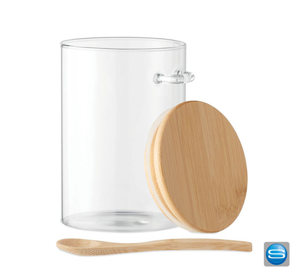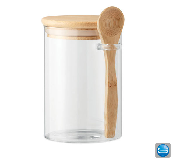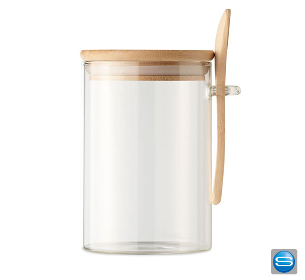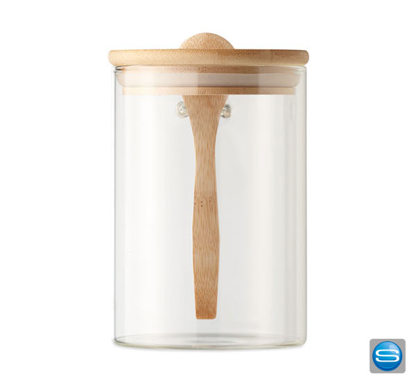 Aufbewahrungsglas mit Verschluss und Löffel aus Bambus individuell mit Logo bedruckt