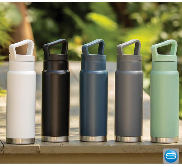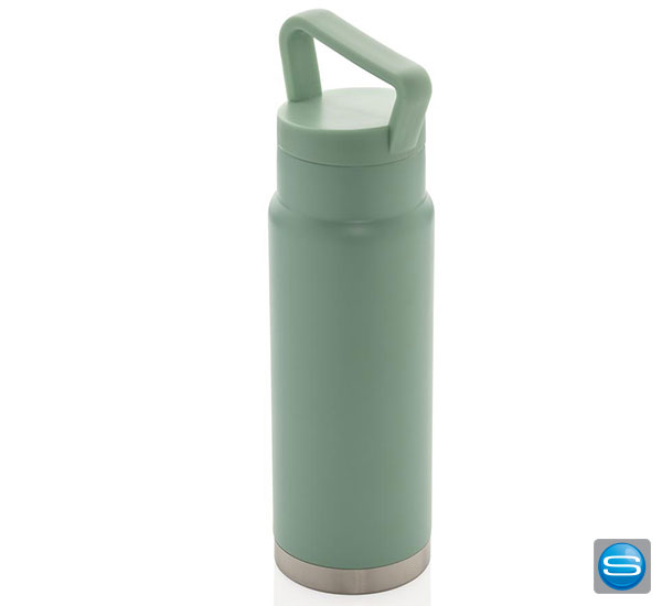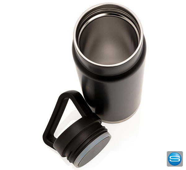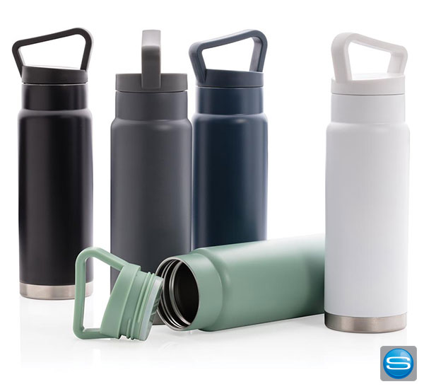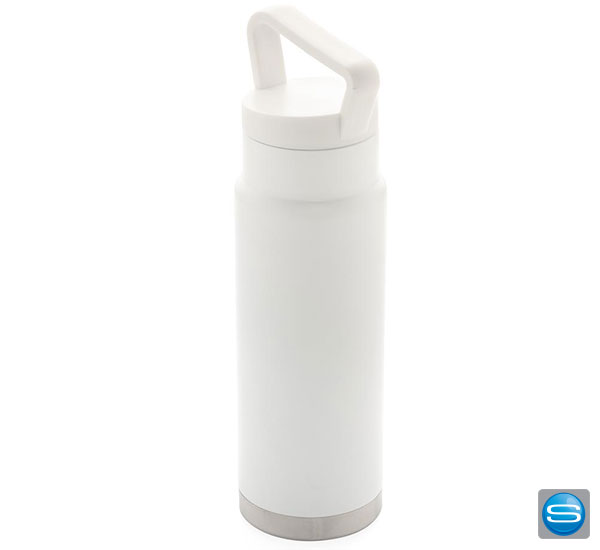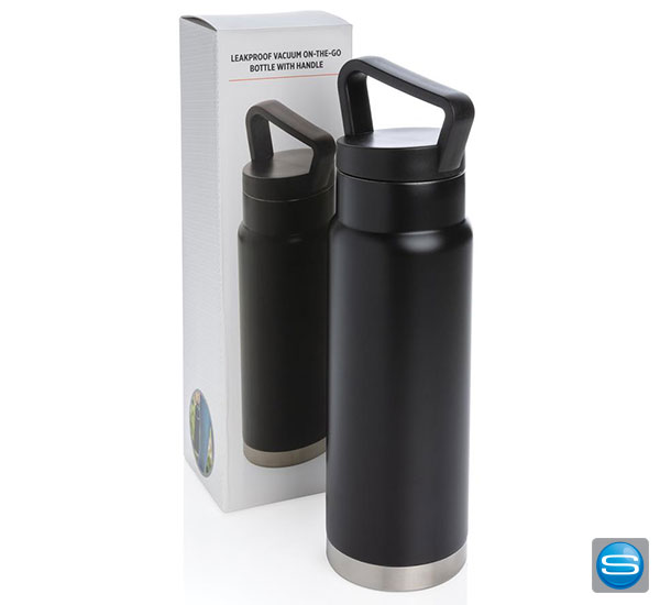 Auslaufsichere Vakuum-Flasche mit Tragegriff aus Stainless Steel mit 650ml Kapazität. Die gravierbare Trinkflasche hält Ihre Getränke bis zu 15 Stunden kalt und bis zu fünf Stunden warm. Die Edelstahlflasche kann per Tampondruck, Lasergravur, Siebdruck-gerundet und personlisiertem Schuber mit Ihrem Firmenlogo versehen werden und eignet sich daher hervorragend als Werbegeschenk. Zudem ist die Flasche BPA frei und lässt sich dank des Tragegriffs überall hin mitnehmen.