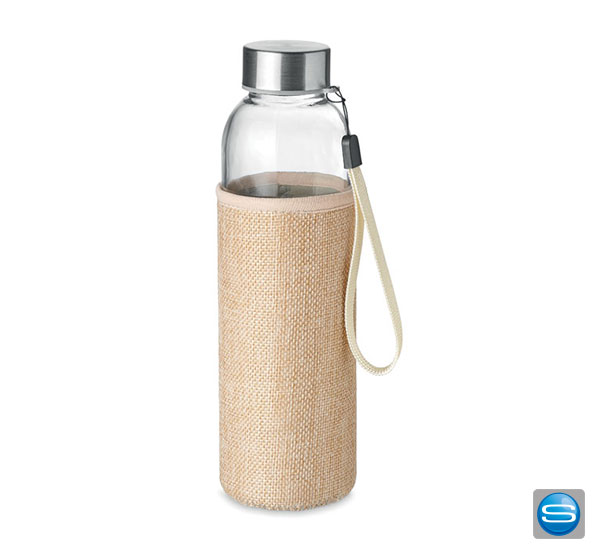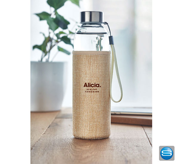 Bedruckbare Glas Trinkflasche mit Jute Schutzhülle