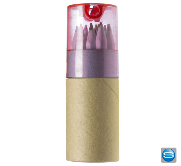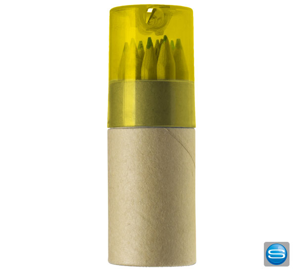 12-teilige Holzstifte-Set im Pappköcher. Im Kunststoffdeckel ist ein Anspitzer integriert. Sie können das Set bei uns mit Ihrem Motiv bedrucken lassen.