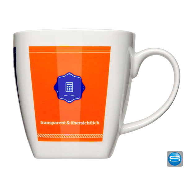 Eckige Mahlwerck Tasse bedruckt mit Ihrer Werbung