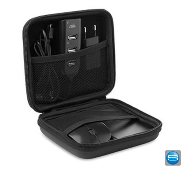Besonderes Computer-Set bestehend aus einer Aluminium-Powerbank mit 4000 mAh, einer kabellosen Maus, einem USB-Hub mit vier Ports und einem EU-USB-Stecker. Diese Produkte sind in einem Etui mit Reißverschluss verpackt. Ein individueller Druck ist auf Etui, Powerbank und Stecker möglich. Kommen Sie gerne auf uns zu.