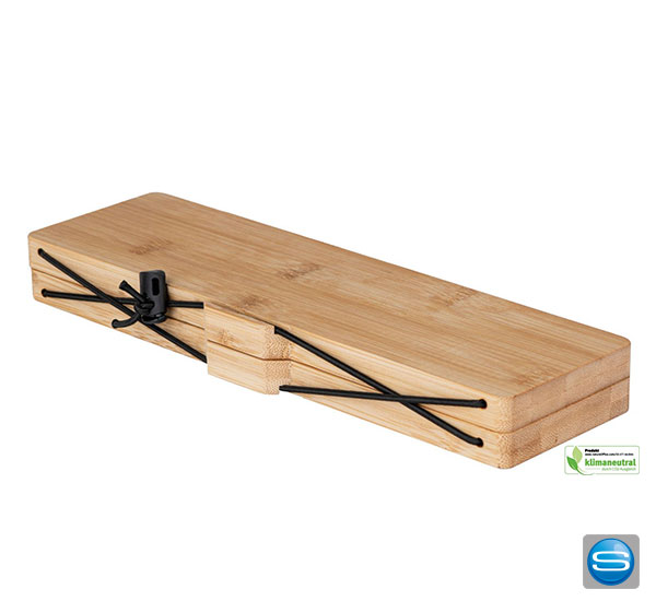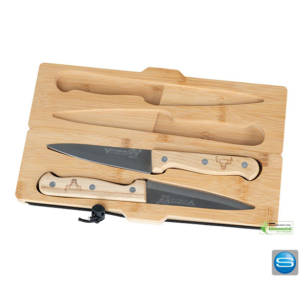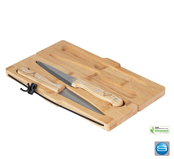 Faltbares Schneidebrett aus Bambus mit Messern als Werbegeschenk