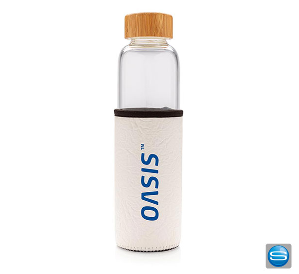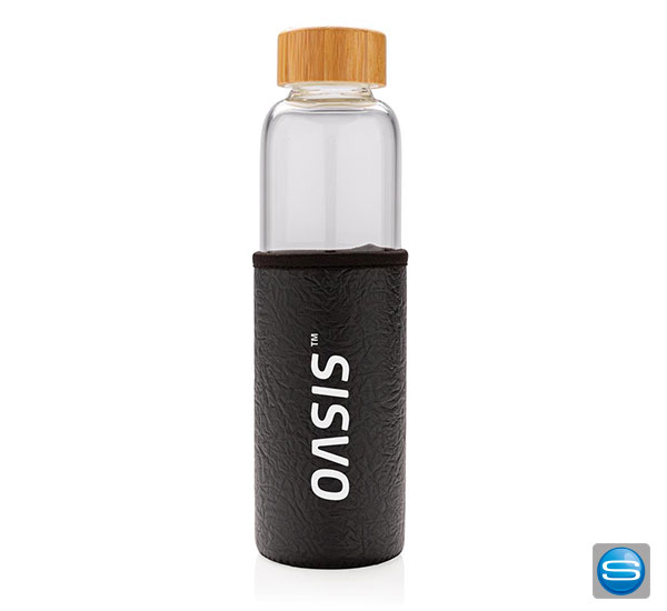Glasflasche mit PU-Sleeve als Werbeträger mit Logodruck