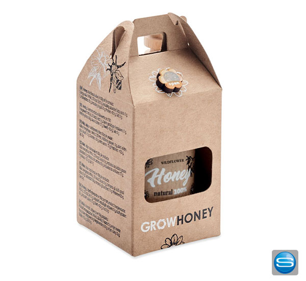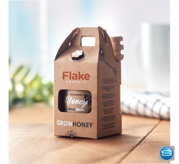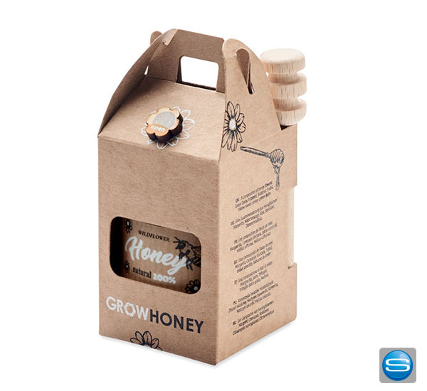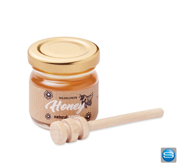 Honig im Glas mit Holzlöffel individuell mit Logo bedrucken