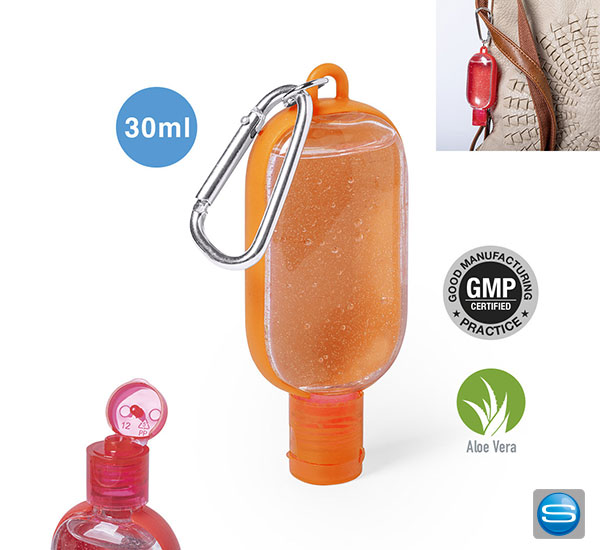 Dieses hydroalkoholische Gel zur Handreinigungs und -hygiene als Ihr treuer Begleiter! Die nachfüllbare 30ml Flasche ist gefüllt mit balsamischem Aloe Vera Extrakt (Lösung mit 65% Alkoholgehalt). Die kleine Fläschchen sind in verschieden Farben verfügbar, verfügen über einen Spender und einen Karabiner der zur Befestigung des Gels an der Tasche oder Hose verwendet werden kann.