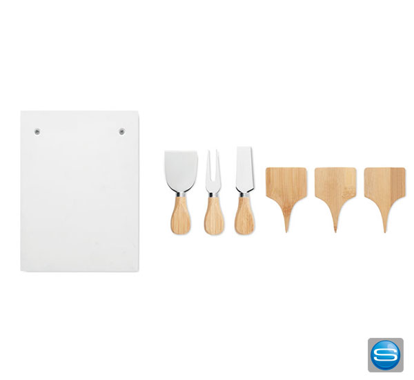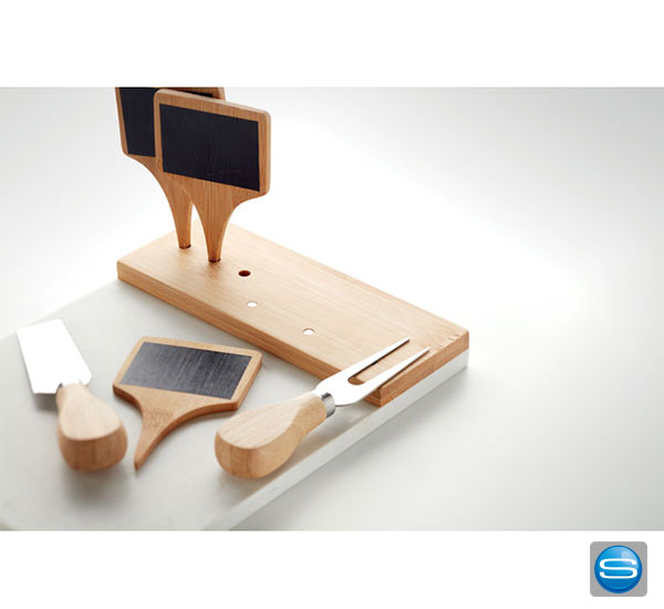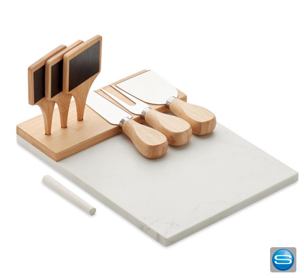 Käseplatte aus Marmor mit 3 Käsewerkzeugen und 3 Appetizer-Markern mit Logodruck