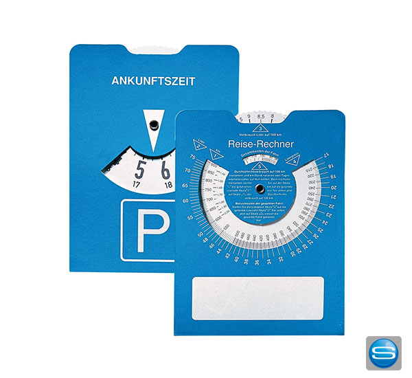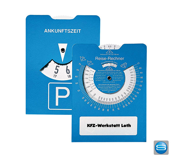 Papp-Parkscheibe mit Reise-Rechner, blau als Werbeartikel