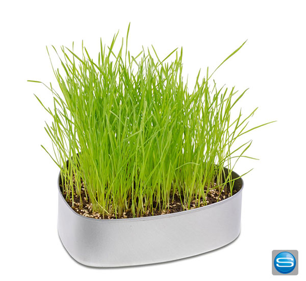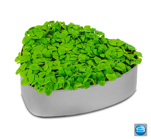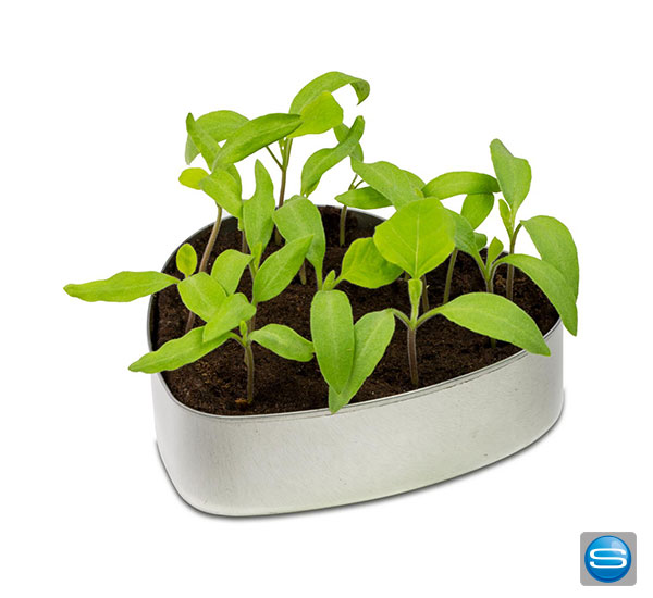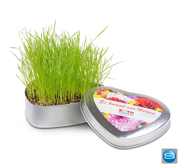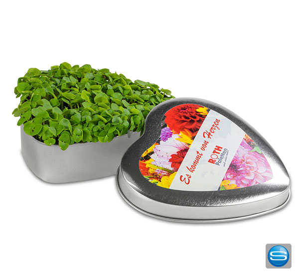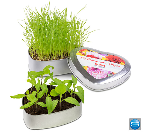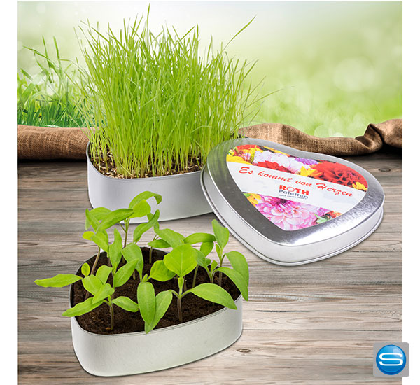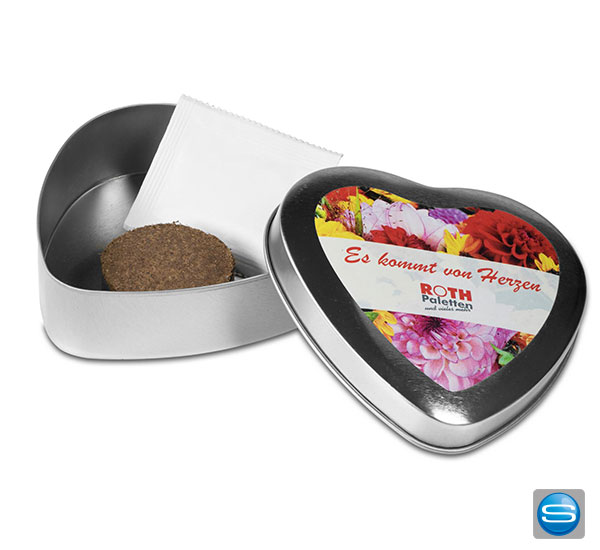 Pflanzensamen in einer Herzdose mit Logo bedruckt