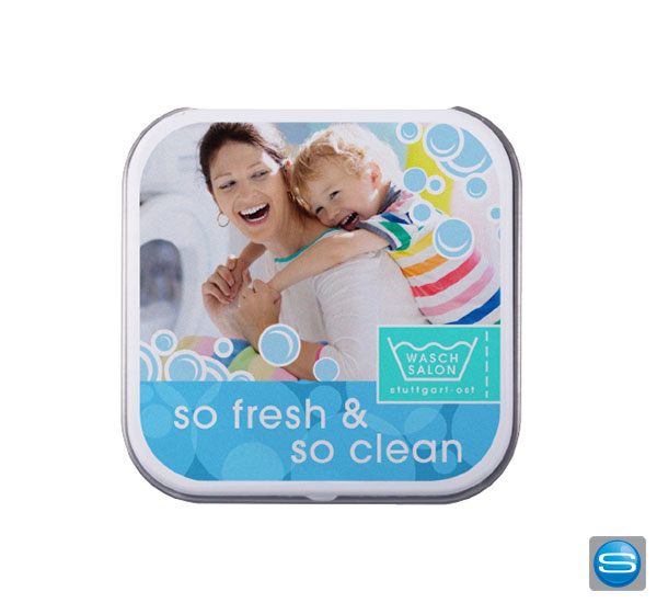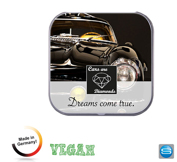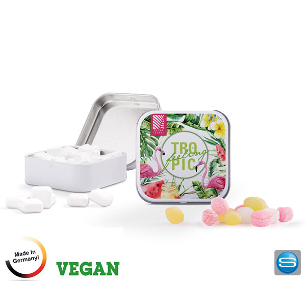 Quadratische Dose mit veganen Bonbons als Werbegeschenk