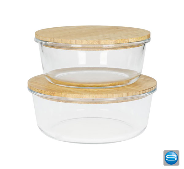 Runde Glasbox mit Bambusdeckel als Werbeträger mit Lasergravur veredeln
