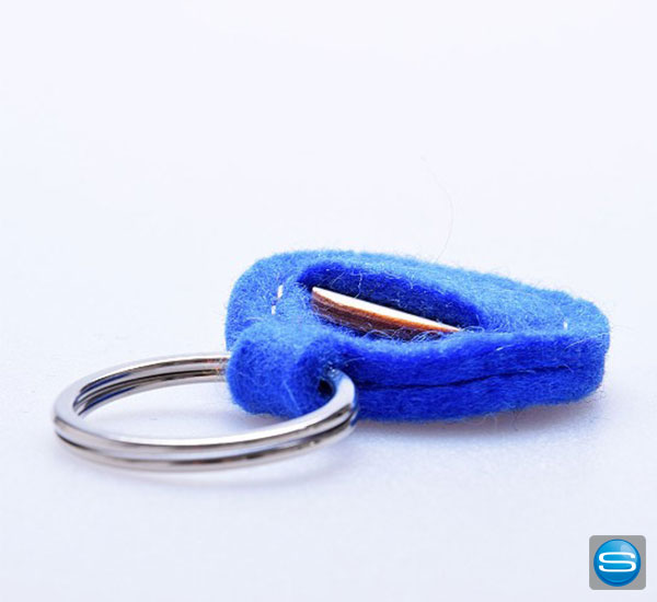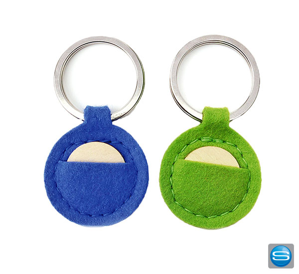 Runder Schlüsselanhänger mit Holz-Einkaufswagenchip aus Wollfilz