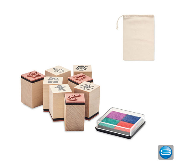Set mit 8 Stempeln aus Holz als Werbegeschenk