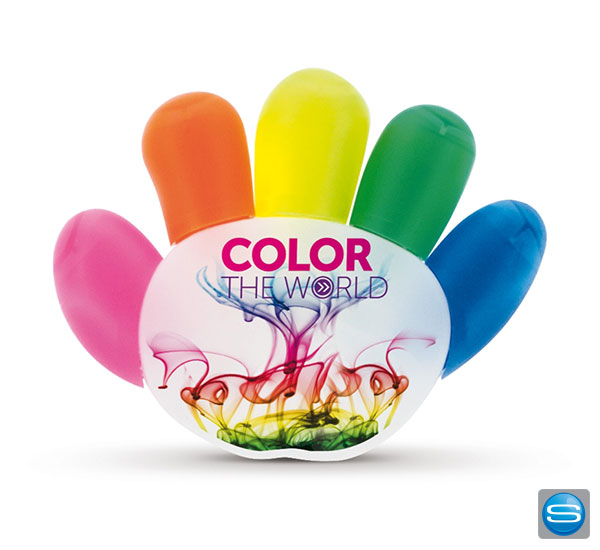 Textmarker in Handform mit 5 Leuchtstiften mit Logo bedrucken
