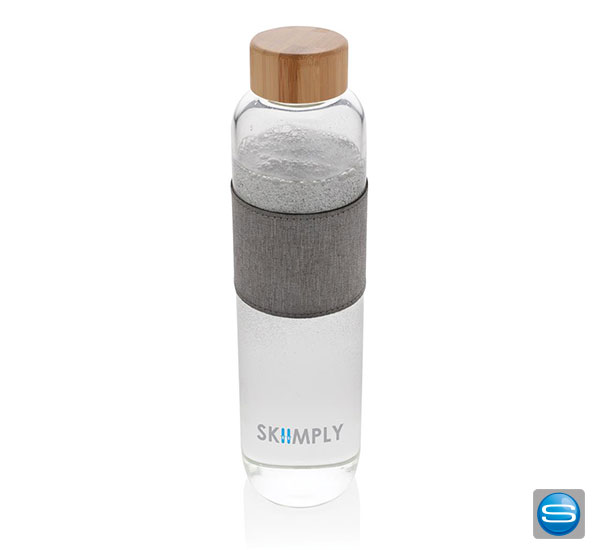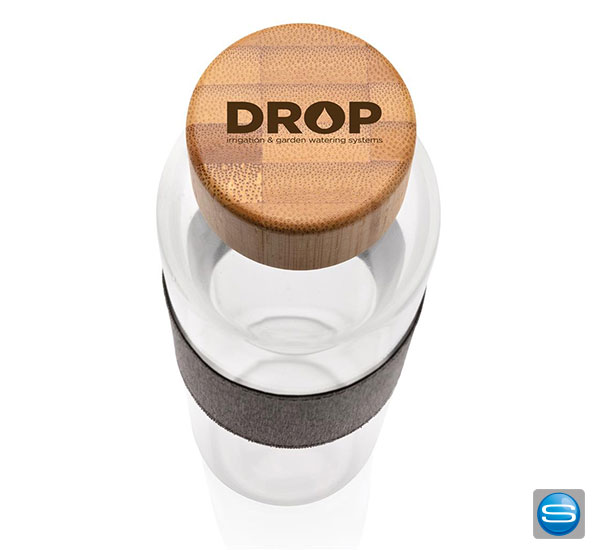 Trinkflasche aus Glas mit Bambusdeckel als Werbemittel mit Logodruck